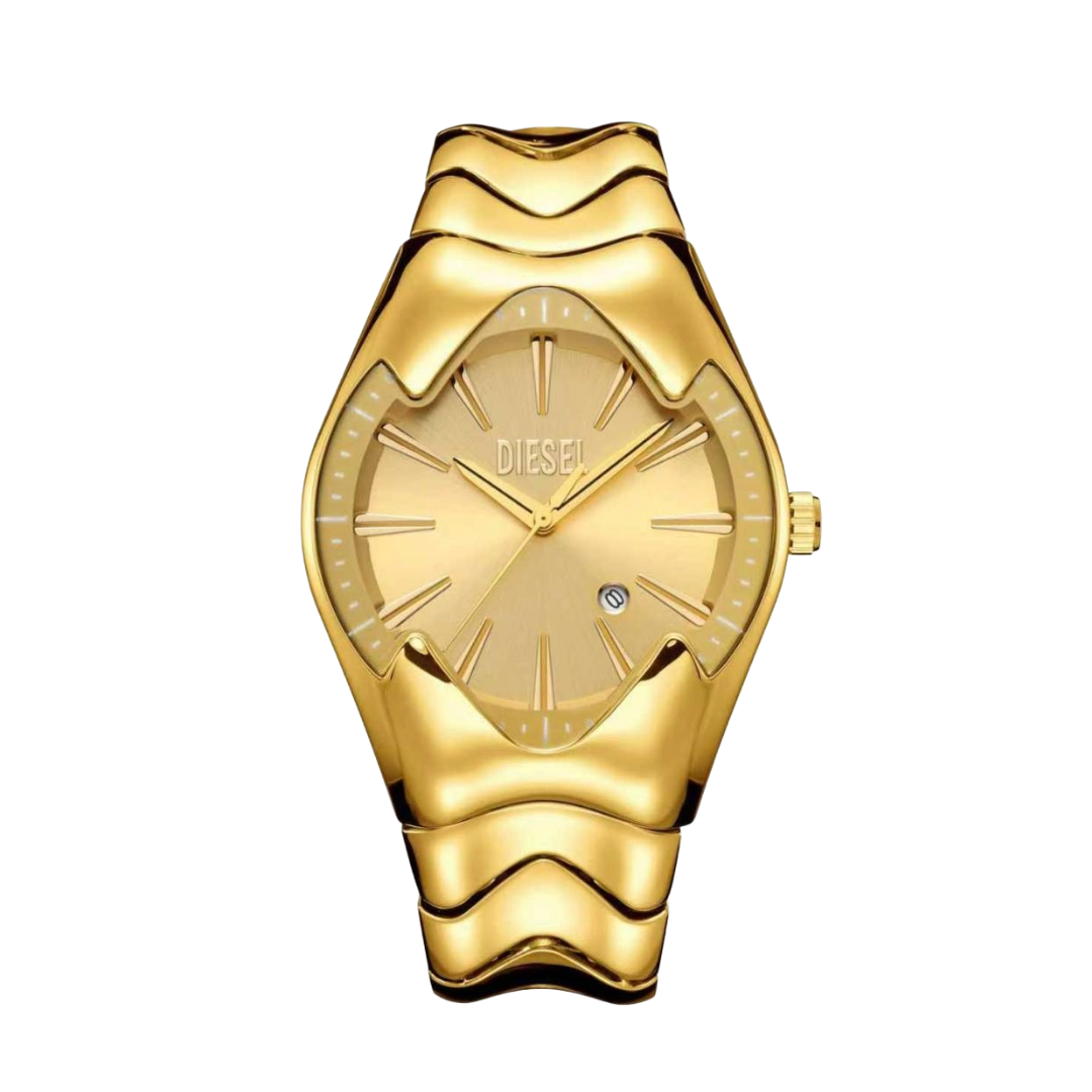 A bold gold-tone timepiece designed to make a powerful style statement. Featuring a sculpted, wave-inspired case and bracelet design, this watch blends modern artistry with everyday elegance.